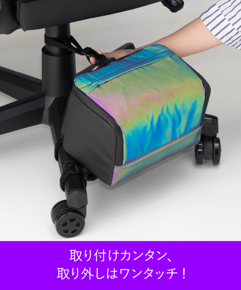 防災グッズは、いつでも持ち出しやすく、ジャマにならない場所に保管したい。そこで、ゲーミングチェアの下部に簡単に設置できて、ワンタッチで取り外しできるBOX型の防災バッグ。座面下部の余白スペースに設置可能で安定感バツグン!キャスター付きのイスなら、お掃除するときの移動もラクラク!オプティカルリフレクションでゲーミングカラーに変化します。“いつも” のイスに、“もしも”のときに、身近なところに安心を備えておきましょう。