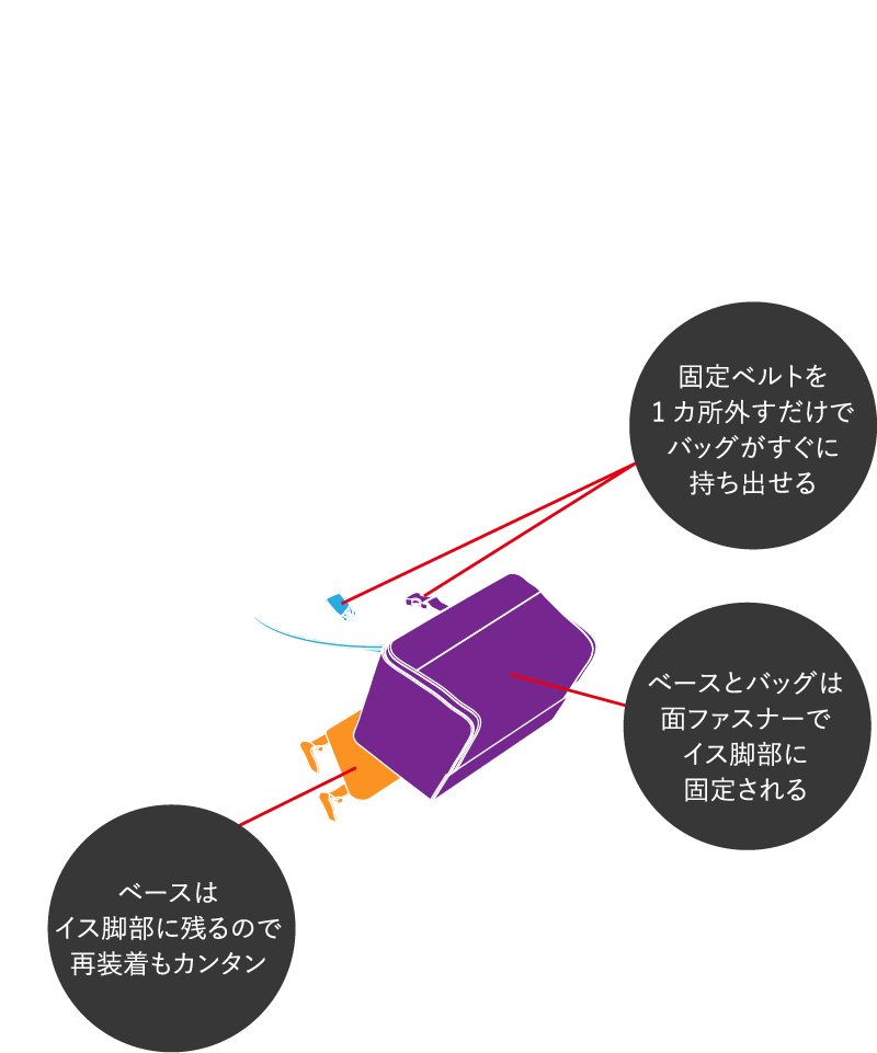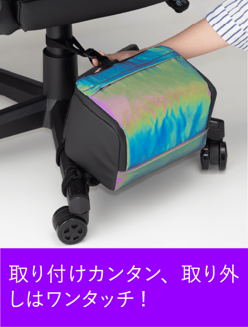 そこで、イス座面と脚部分の間の余白スペースを活用。イス脚部にベース部分を固定、バッグは「ワンタッチ」で着脱可能に。