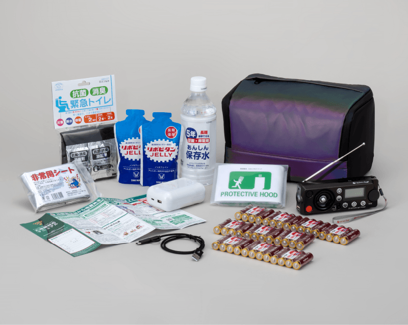 保存水500ml、ゼリー飲料×2個、トイレ2回分、乾電池式モバイルバッテリー、スマホ充電対応ラジオ付ライト、長期保存アルカリ乾電池40本、アルミシート、防煙シート、真空下着3点セット、震災マニュアル