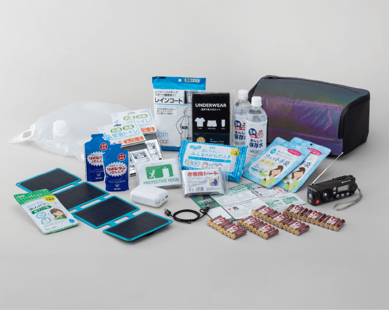 保存水500ml×2本、ゼリー飲料×2個、トイレ4回分、給水バッグ5L、乾電池式モバイルバッテリー、スマホ充電対応ラジオ付ライト、長期保存アルカリ乾電池40本、ノンアルコールタイプ体ふきシート、水のいらない泡なしシャンプーウエット手袋、歯みがきシート、レインコート、アルミシート、防煙シート、ソーラー充電器、真空下着3点セット、震災マニュアル
